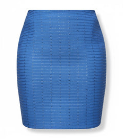 Experience the tactile luxury of the Adun Skirt. Meticulously crafted from a high-quality, structured fabric, this piece features a unique, horizontally ribbed texture that offers both visual depth and a figure-sculpting fit. The intricate weave is punctuated by subtle, scattered embellishments that catch the light with every movement, adding a whisper of glamour to the matte finish of the rich blue textile.